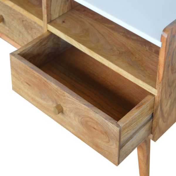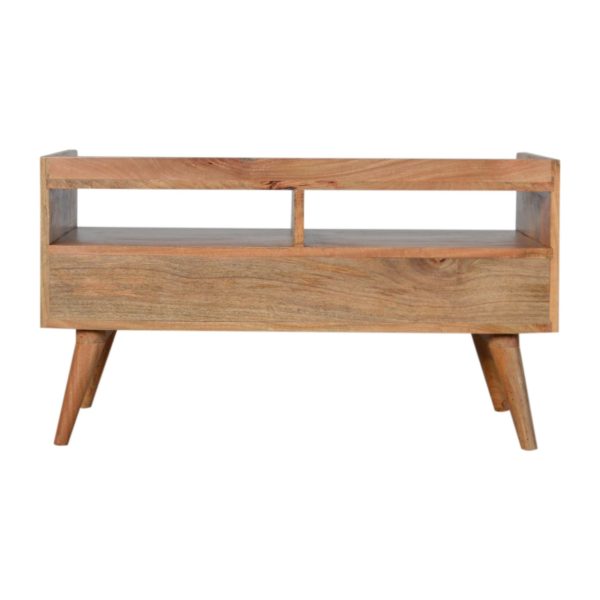 This oak toned tv unit is crafted from solid mango wood with a smooth oak-like finish and a faux marble top. Featuring two drawers, two open slots, and a gallery back, it provides practical storage for media and décor. The marble top tv unit design, supported by Nordic-style legs, combines stylish elegance with functional organisation for any living space.