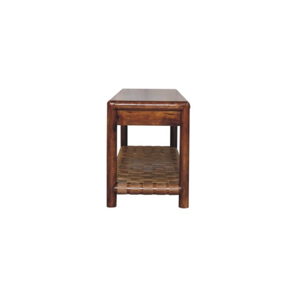 This luxury wooden bench is crafted from solid mango wood in a rich chestnut finish, showcasing refined craftsmanship and timeless appeal. Its distinctive woven bottom shelf adds texture and practical storage, ideal for baskets, shoes or décor. Designed as a woven shelf bench, it combines elegant style with everyday functionality, making it a sophisticated addition to entryways, bedrooms or living spaces.